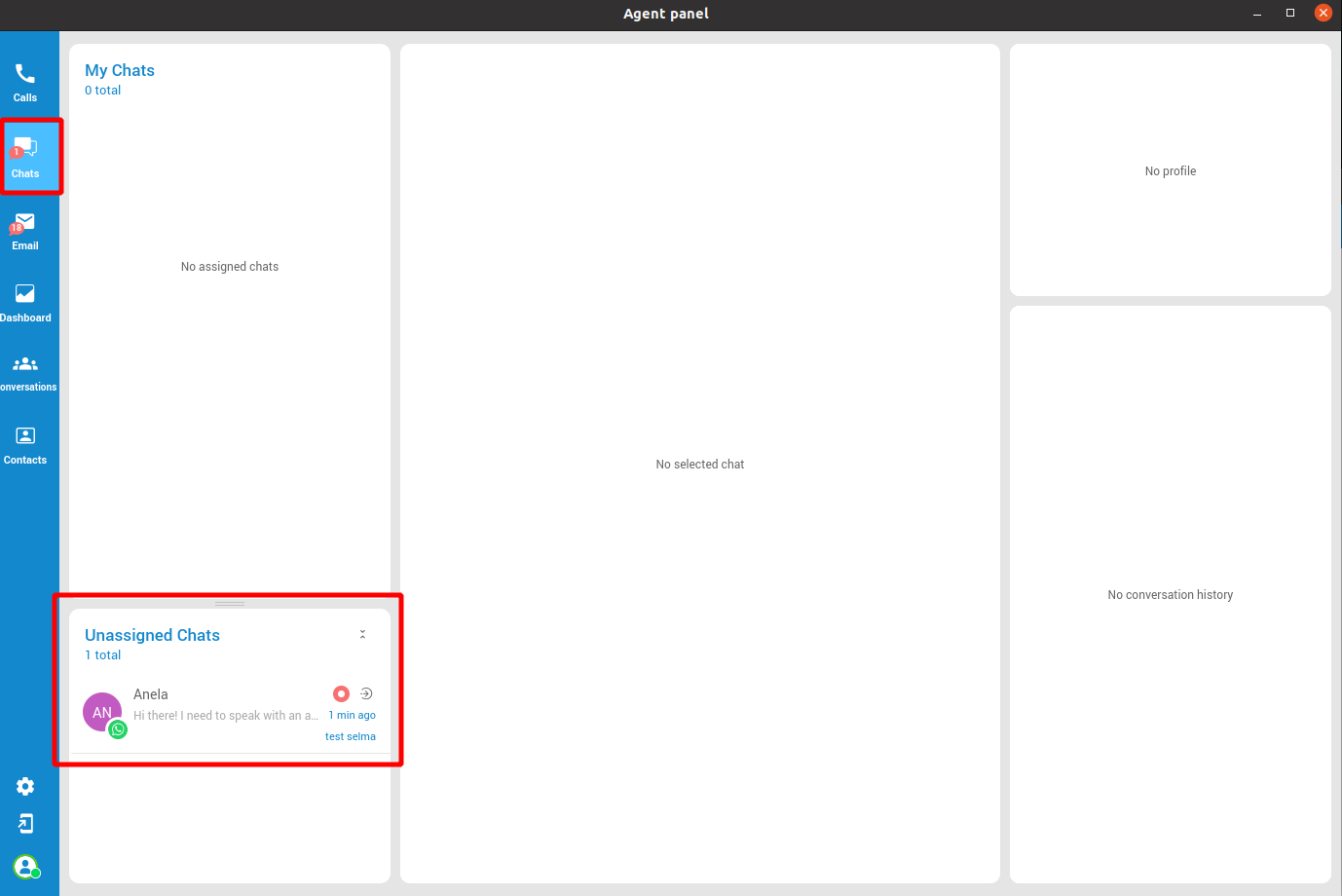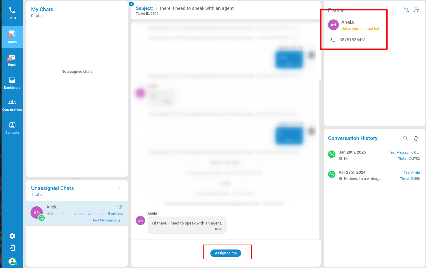 - After the agent assigns the conversation to themselves, they will be able to interact with the client who sent the message to the WA number.