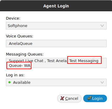 Once the agent associated with the Queue attempts to log in, a Messaging Queue will appear in the agent's login panel. After clicking the "Login" button, the agent should be able to receive messages from WhatsApp.
