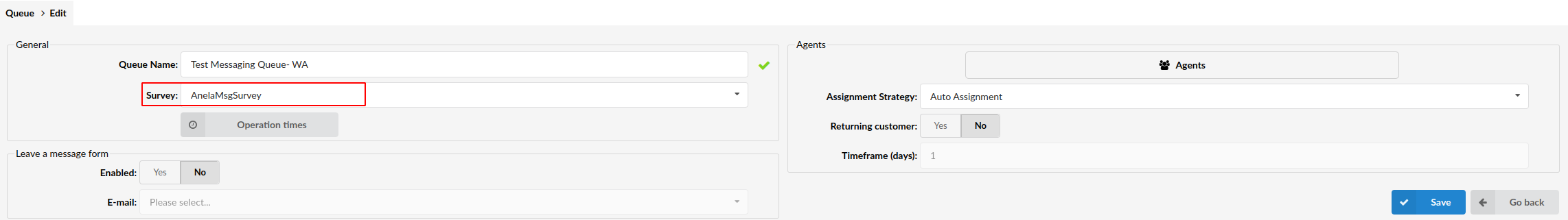 In this example, the Queue "Test Messaging Queue-WA" is used, with agents assigned to it. On the other hand, the WhatsApp number 17862329218 is configured for integration with PBXware.