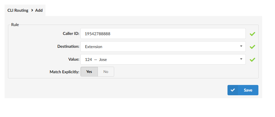 Explicit Match: To route a specific caller (e.g., CallerID 19542788888) to a designated extension (124), enter the full number and ensure the Match Explicitly setting is enabled.