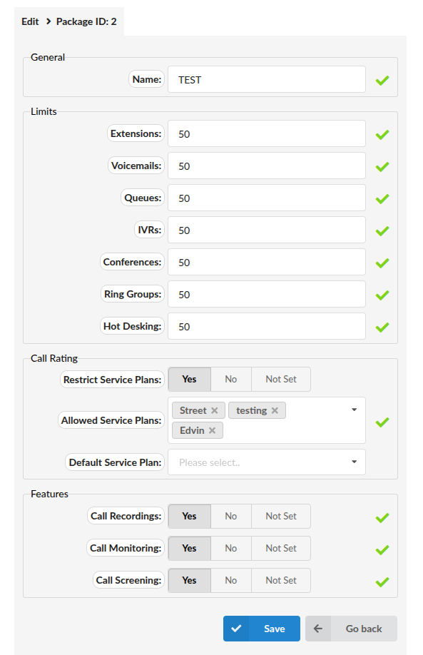 - Call Recordings - Choose to enable or disable Call Recordings on tenant using this package. If you disable it, you will not be able to record call on extension's level and DID.