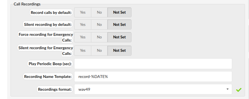 - Recordings format - The file format used for saving the call recordings and voicemail messages. Availabe formats: gsm, wav, wav49, G729 native -> GSM or ogg. If wav is selected, all call recordings and voicemail messages will be saved in wav format.