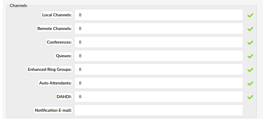 - Local Channels - Total number of all channels used by local UADs. Example: If there is a call coming through the trunk to a Ring Group that has 10 members, there will be 1 remote and 10 local channels used.