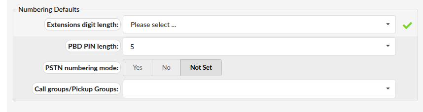- Extensions digit length - A number of digits used by the system to create local extensions, IVRs, Queues, Voicemail boxes, Conferences, etc. This option is available for settings only during the setup wizard install process. To change the number of digits later, you must remove all the PBXware elements (Extensions, Ring Groups, Conferences, IVRs, and Voicemail boxes) you previously created. The best way to determine the number of digits you should use would be to take the number of extensions you need at the moment and calculate for eventual expansions in the future while also considering the number of Ring Groups, Conferences, IVRs, etc. to prevent having to change the digit length in the future. The recommended value for this field is 4.