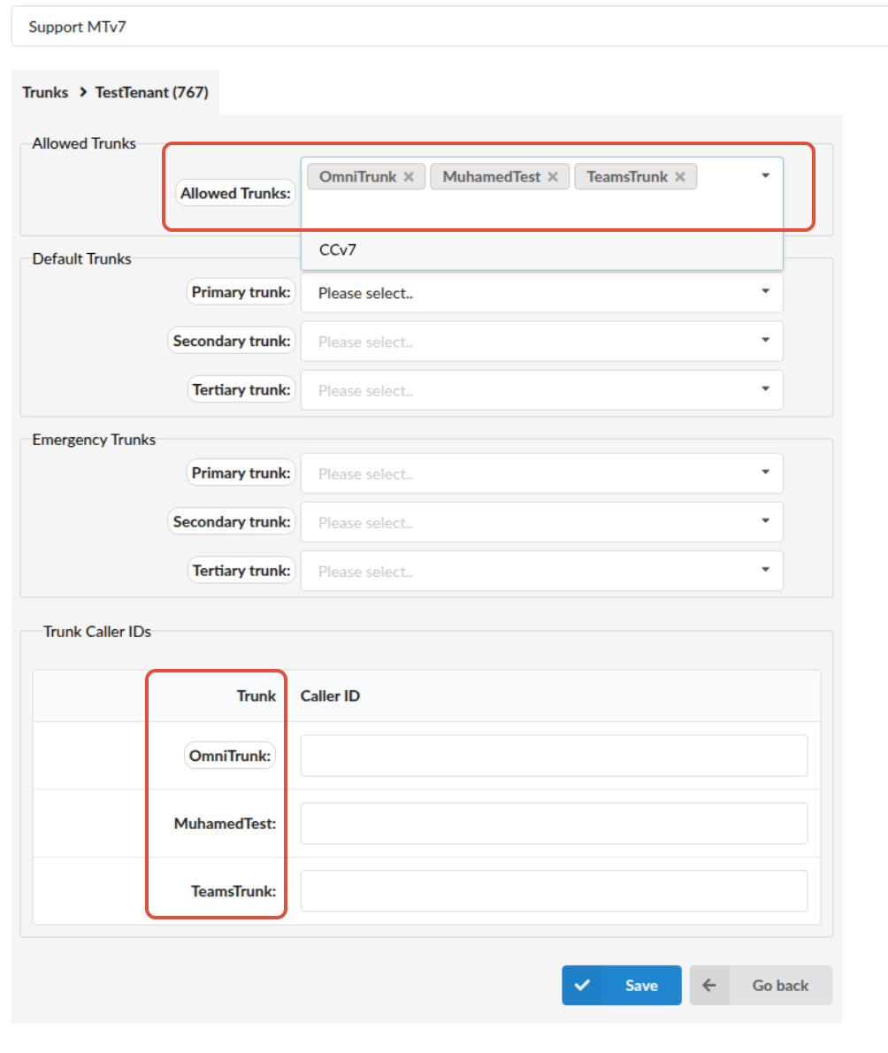 - Allowed Trunks - Choose which of the available trunks will be used for incoming/outgoing calls on this Tenant. Only Trunks chosen here will be available in the fields below. After you choose the trunks in the "Allowed Trunks" option, they will be available for selection in the fields below.