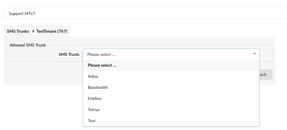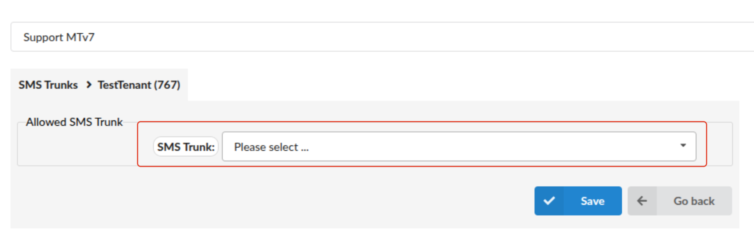 You will have the option to select a SMS trunk from the dropdown menu. Only SMS trunks that are already configured on the system will be available for selection.