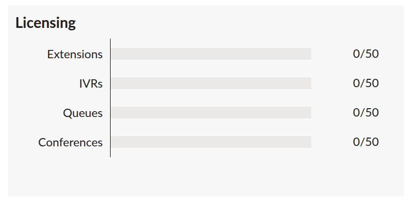 If you scroll down a little bit, you will see the section that is presenting the limits of the tenant in the terms of number of extensions, IVRs, Queues and Conferences.