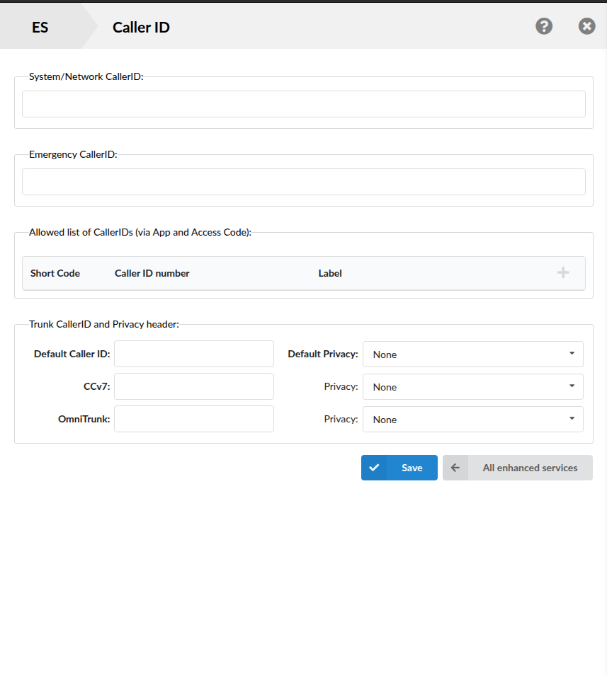 Short Code is used to define a single digit, which will replace the "Caller ID Number" so users do not have to enter the entire Caller ID manually. In case there is no Caller ID matching the dialled Short Code the call will fail, otherwise the Caller ID associated with that Short Code will be used. - Trunk CallerID and Privacy header - is used to define an outbound Caller ID. For each Trunk which is allowed for a Tenant on which the Extension is located, there will be a separate field in which a custom Caller ID can be set when the user is making a call over that specific trunk.