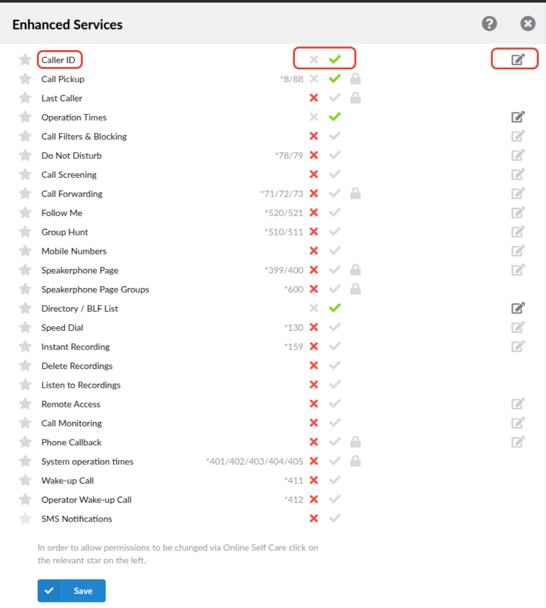In order to configure Caller ID, first you need to enable that service. Enabled service has a green check mark. To configure the service, click on the "Settings" button on right-hand side.