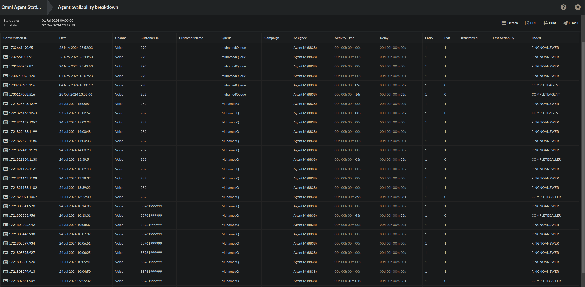 The agent availability breakdown provides comprehensive information about a specific agent, including details such as the conversation ID and the date and time of the call. It also displays the channel type used for the call, the Customer ID (indicating the number or extension), and the customer's name, if available. Additionally, it identifies the queue the agent belongs to and whether the agent is part of a campaign. The breakdown includes the activity time, which indicates the call duration, and notes if the call was transferred, who performed the last action, and how the call concluded.