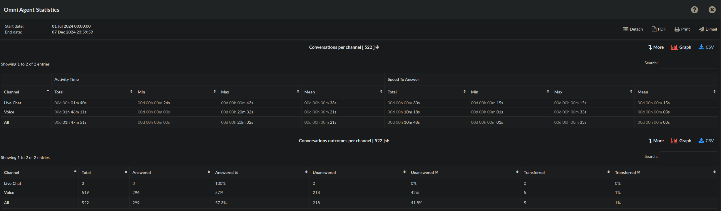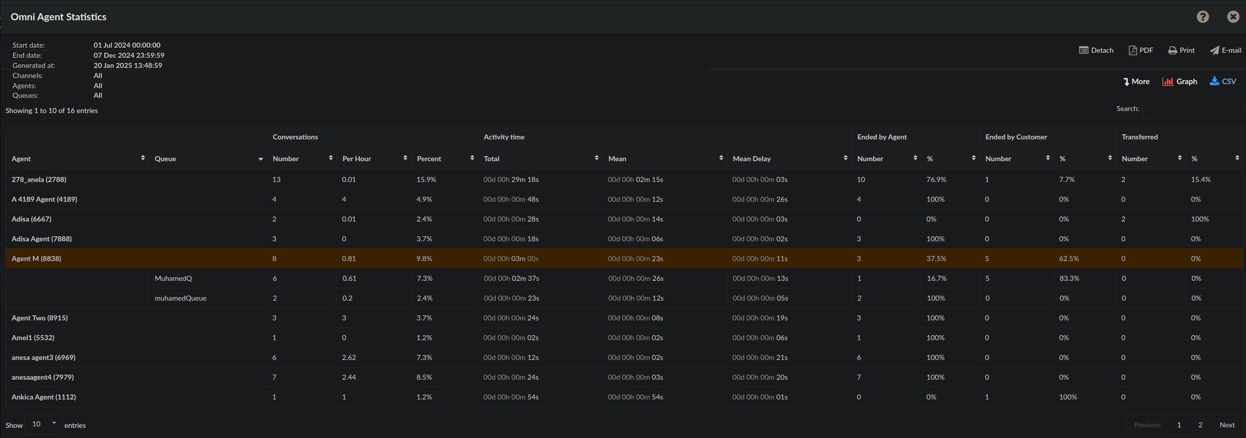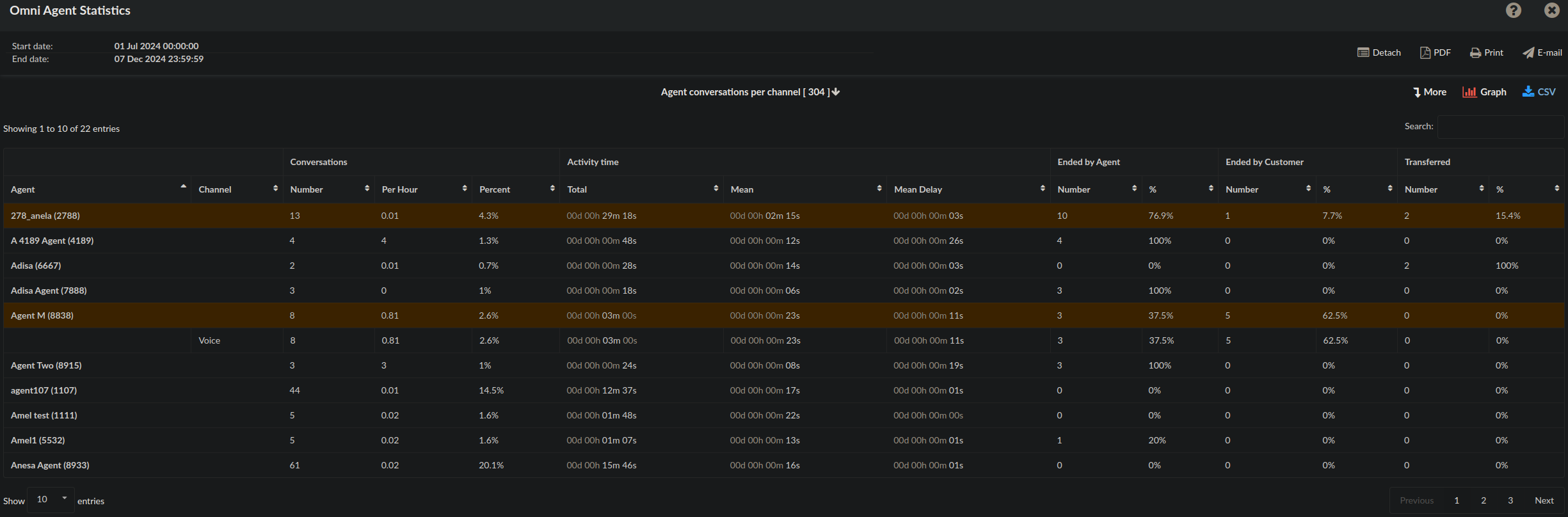 Once again, the breakdown of the statistics provides detailed information about all conversations per channel, offering insights into key metrics such as activity time, speed to answer, and conversation outcomes. This allows for a comprehensive understanding of agent performance and response efficiency across different communication channels.