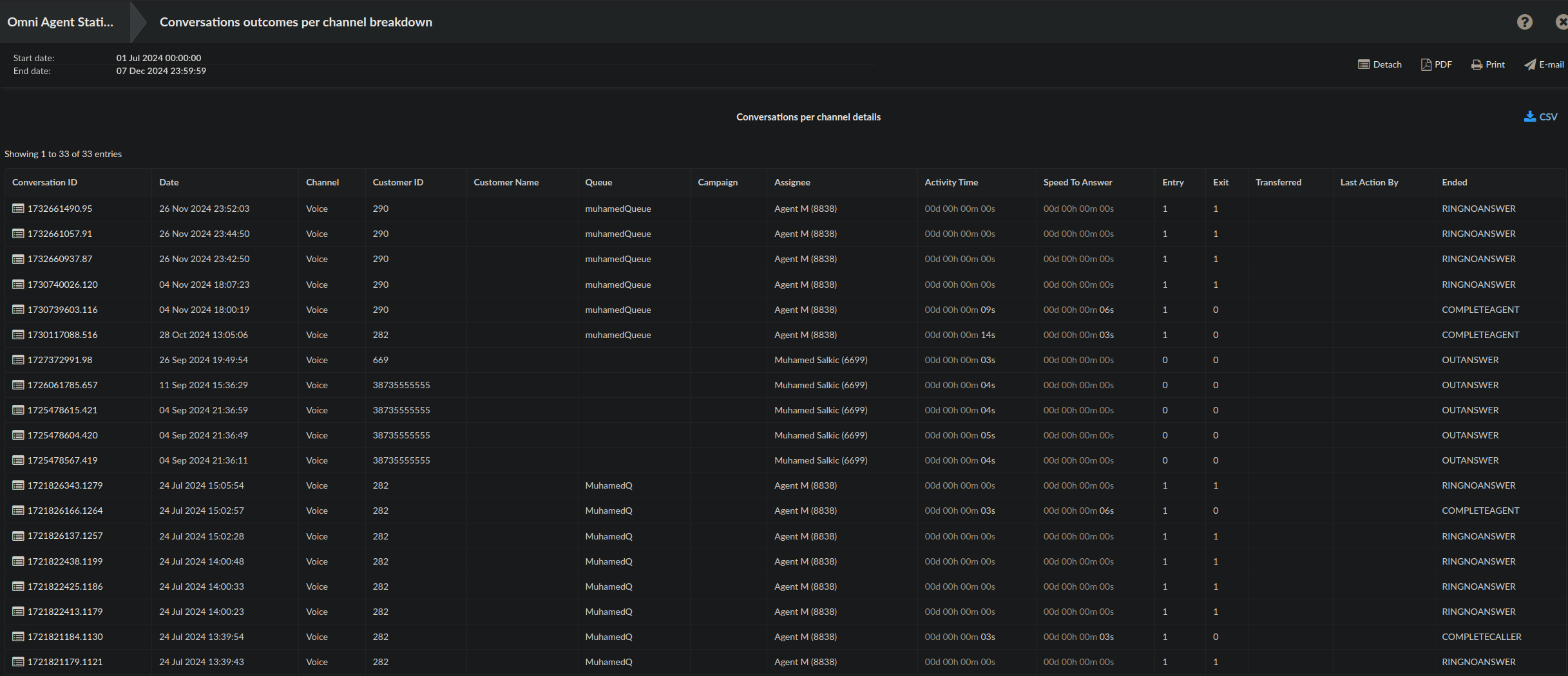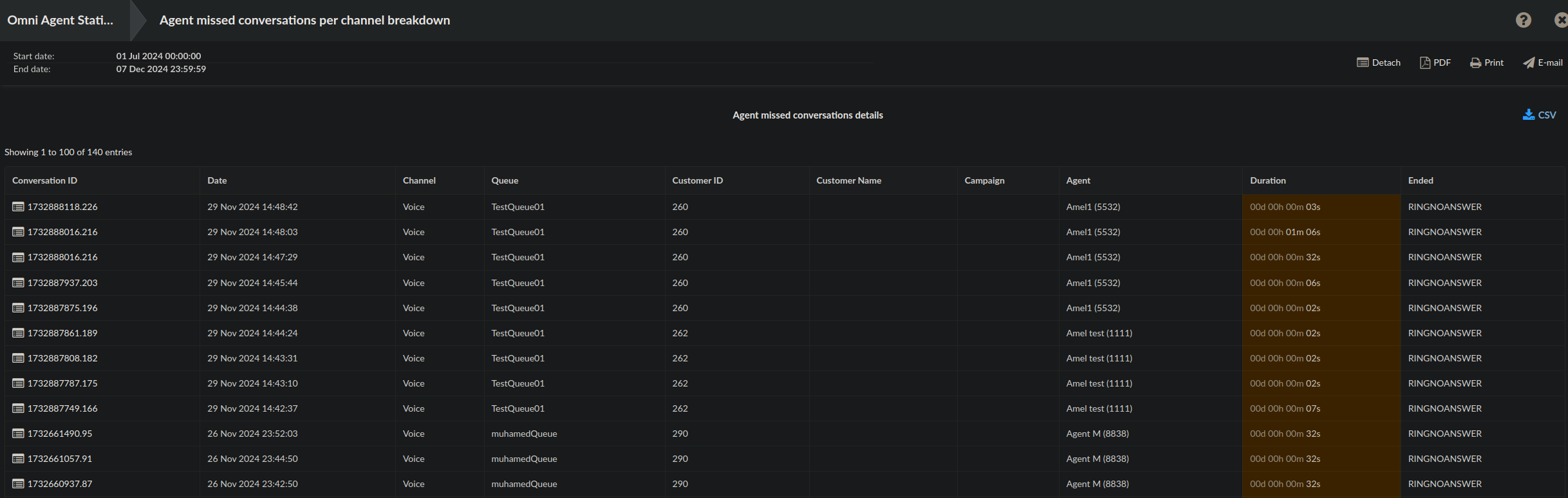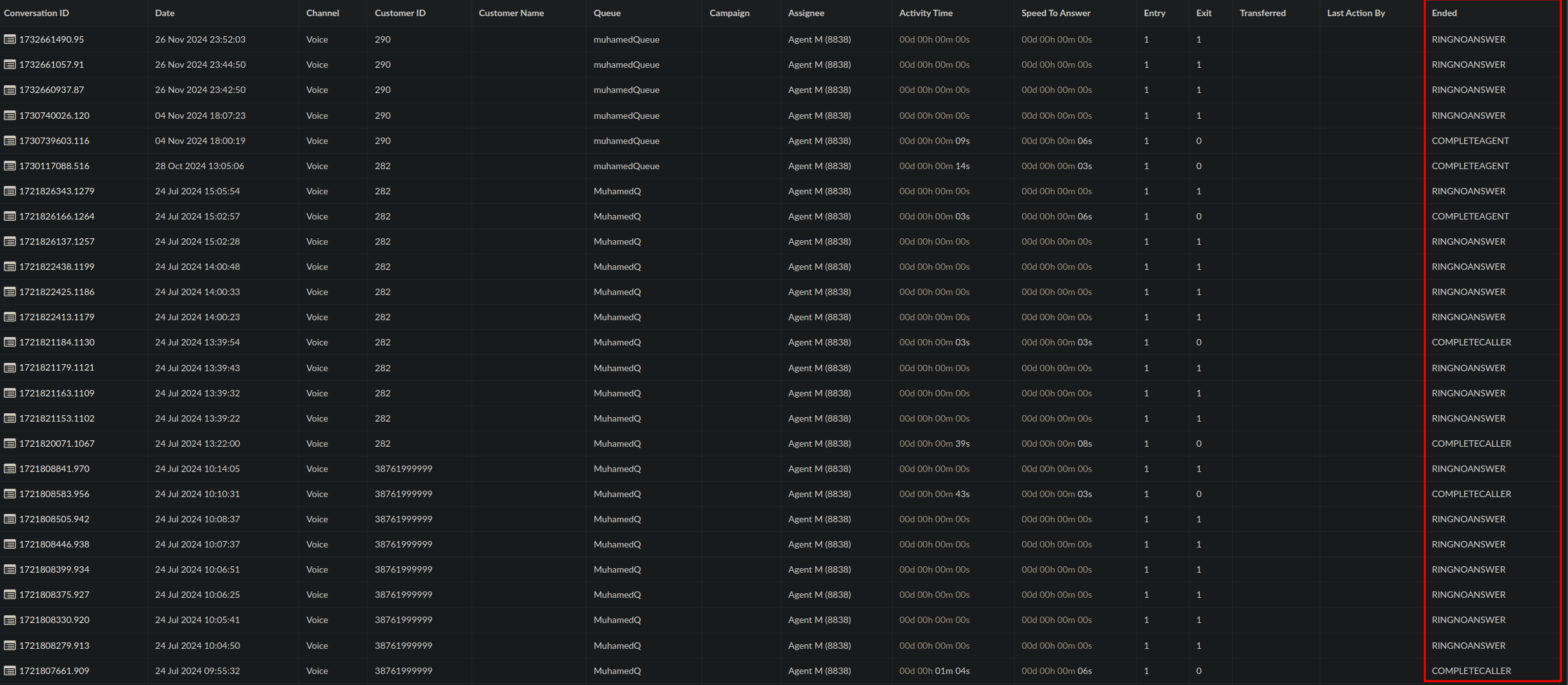 After selecting the Agent missed conversations per channel breakdown we could see additional information for each missed calls, which would usually show RINGNOANSWER on the Ended field.