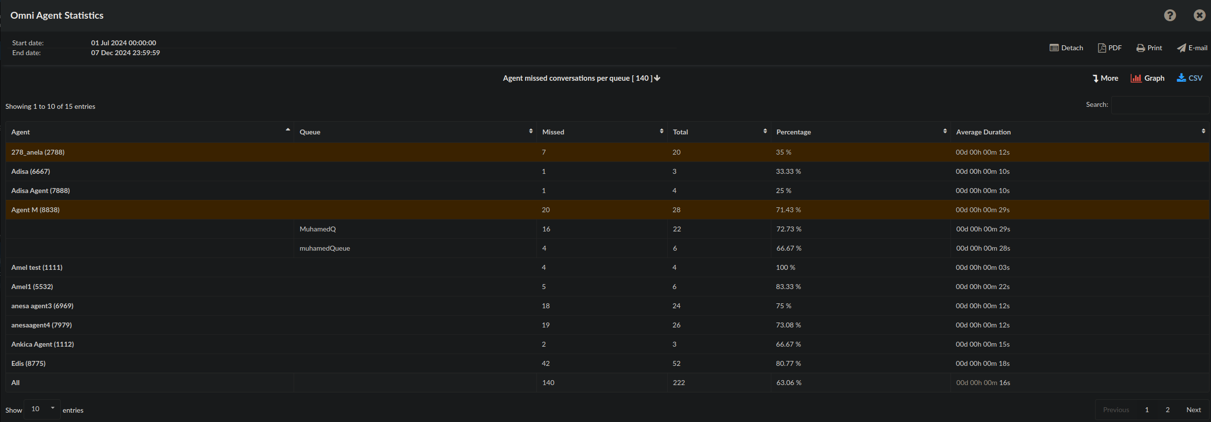 As demonstrated once again, the 'Agent Missed Conversations per Queue' breakdown provides a list of 'RINGNOANSWER' calls, showing the missed calls for each agent per queue.