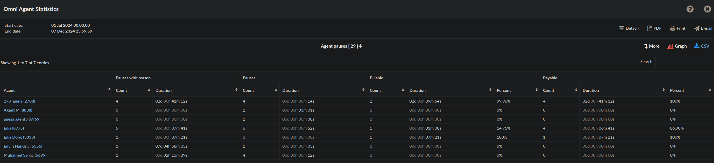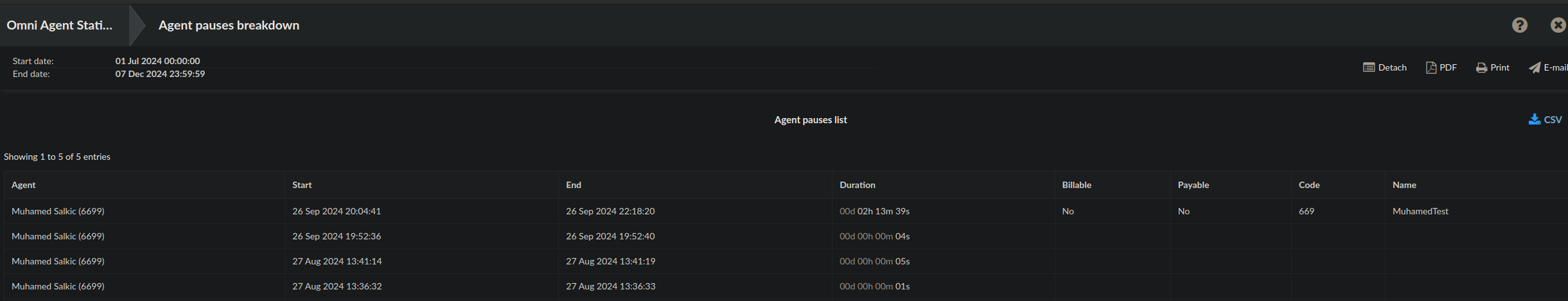 Individual agents can be selected if they have recorded pauses in their work. Upon selecting a specific agent, a list of all their pauses is displayed. Additionally, more detailed information about each pause is available, including the start and end date, duration, whether the pause was billable or payable, the associated reason codes, and the name of the pause.