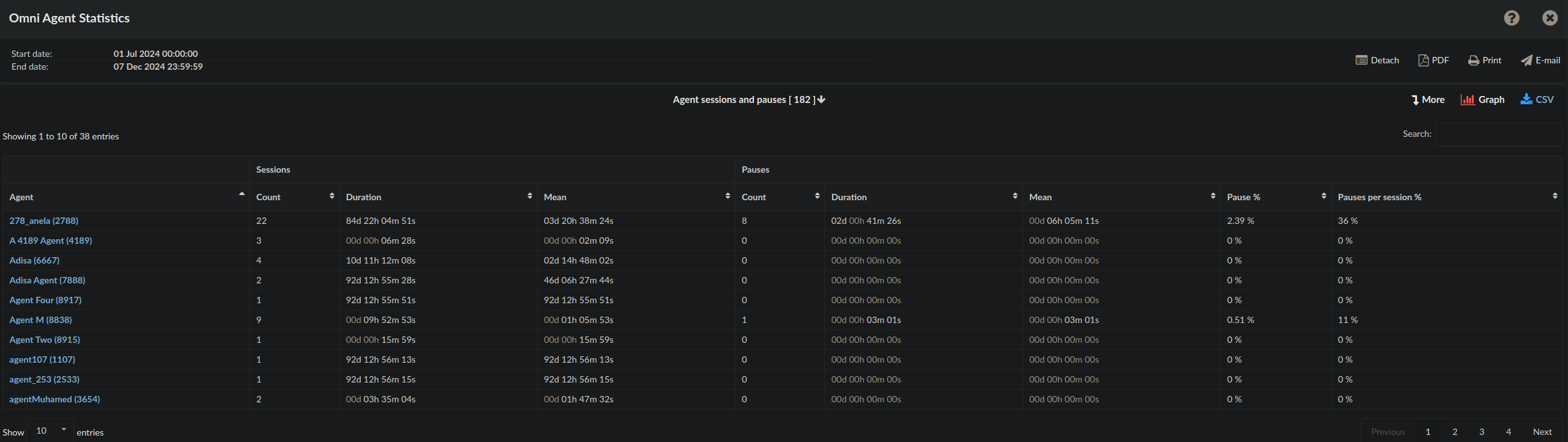 Agent sessions and pauses report section shows details about agent pauses and session. With this report you can compare agent pauses against agent logins.