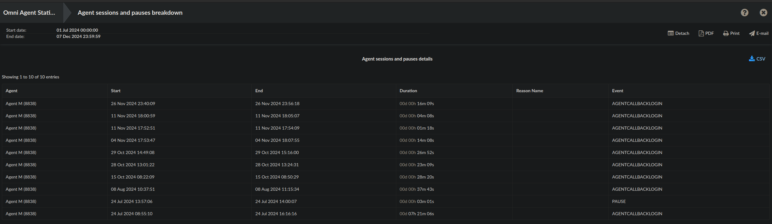 The Agent Sessions and Pauses breakdown provides detailed information for each specific agent. It includes the start and end date, session duration, and a record of all events that occurred during the session.