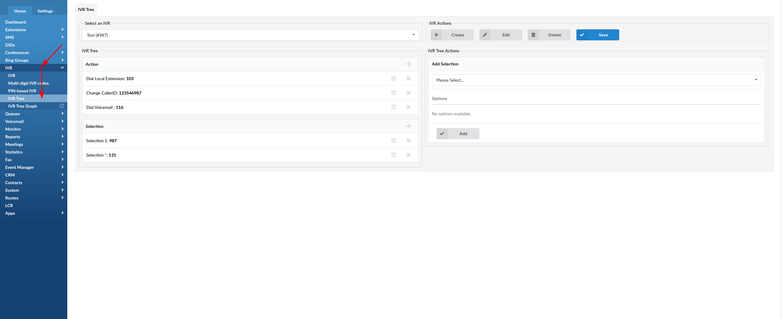The IVR Tree consists of Action and Selection. Actions are items that are going to be executed when the user enters IVR. Selections can be configured to be executed by pressing the DTMF keys on your phone.